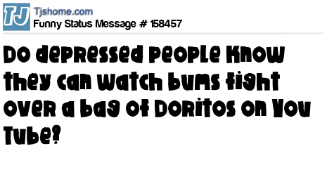 X says Do depressed people know they can watch bums fight over a bag of Doritos on You Tube?
