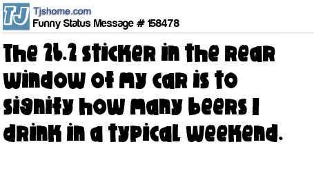 X says The 26.2 sticker in the rear window of my car is to signify how many beers I drink in a typical weekend.