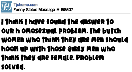 X says I think I have found the answer to our h omosexual problem. The butch women who think they are men should hook up with those girly men who think they are female. Problem solved.