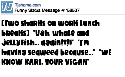 X says [Two sharks on work lunch breaks] "Ugh, whale and jellyfish... again?!?!" "I'm having seaweed because..." "WE KNOW KARL, YOUR VEGAN"