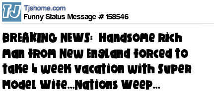 X says BREAKING NEWS: Handsome rich man from New England forced to take 4 week vacation with Super Model Wife...Nations Weep...