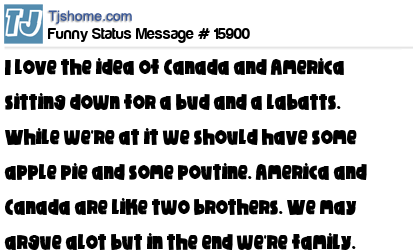 X I love the idea of Canada and America sitting down for a bud and a labatts. While we're at it we should have some apple pie and some poutine. America and Canada are like two brothers. We may argue alot but in the end we're family. Hey america. you ROCK!
