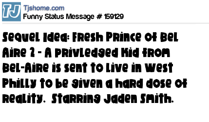 X says Sequel Idea: Fresh Prince of Bel Aire 2 - A privledged kid from Bel-Aire is sent to live in West Philly to be given a hard dose of reality. Starring Jaden Smith.