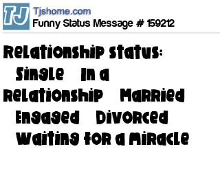 - # 71742 Relationship Status: ( ) Single ( ) In a Relationship ( ) Married ( ) Engaged ( ) Divorced (X) Waiting for a miracle