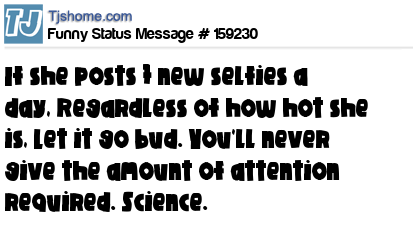 X says If she posts 7 new selfies a day, Regardless of how hot she is, Let it go bud. You'll never give the amount of attention required. Science.