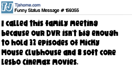X says I called this family meeting because our DVR isn't big enough to hold 32 episodes of Micky Mouse Clubhouse and 8 soft core lesbo Cinemax movies.