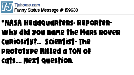 X *NASA Headquarters: Reporter- Why did you name the Mars rover Curiosity?... Scientist- The prototype killed a TON of cats.... Next question.
