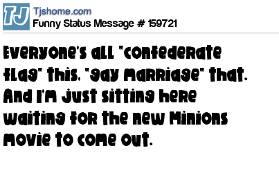 X says Everyone's all "confederate flag" this, "gay marriage" that. And I'm just sitting here waiting for the new Minions movie to come out.