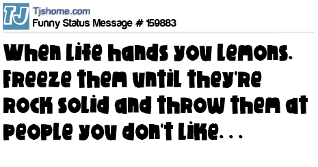 - # 7487 Sometimes when life hands you lemons you just need to take those lemons and throw them back in life's face and say "How dare you!!! Don't come back here till you have some oranges or at least a pretty good sized grapefruit!"