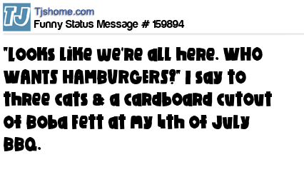 X "Looks like we're all here. WHO WANTS HAMBURGERS?" I say to three cats & a cardboard cutout of Boba Fett at my 4th of July BBQ.