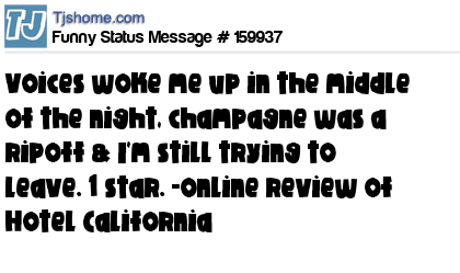 X says Voices woke me up in the middle of the night, champagne was a ripoff & I'm still trying to leave. 1 star. -online review of Hotel California