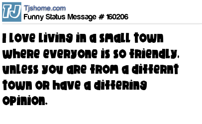 X says I love living in a small town where everyone is so friendly, unless you are from a differnt town or have a differing opinion.
