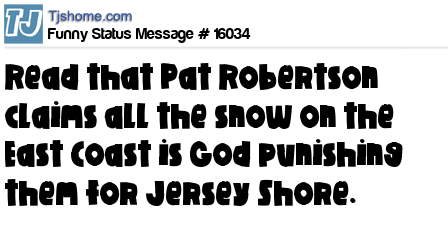 X read that Pat Robertson claims all the snow on the East Coast is God punishing them for Jersey Shore.