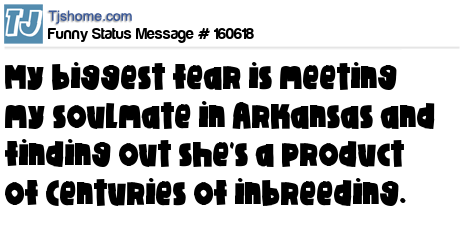 X says My biggest fear is meeting my soulmate in Arkansas and finding out she's a product of Centuries of inbreeding.