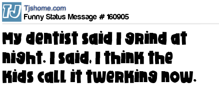 X My dentist said I grind at night. I said, I think the kids call it twerking now.