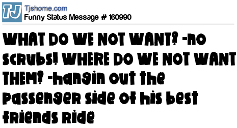 X says WHAT DO WE NOT WANT? -no scrubs! WHERE DO WE NOT WANT THEM? -hangin out the passenger side of his best friends ride