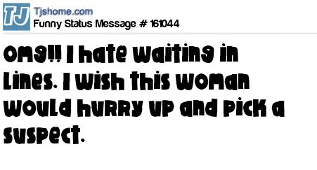 X is Omg!! I hate waiting in lines. I wish this woman would hurry up and pick a suspect.