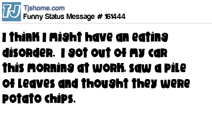 X says I think I might have an eating disorder. I got out of my car this morning at work, saw a pile of leaves and thought they were potato chips.