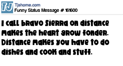 X says I call bravo Sierra on distance makes the heart grow fonder. Distance makes you have to do dishes and cook and stuff.