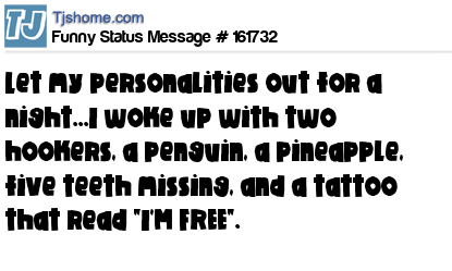 X says let my personalities out for a night...I woke up with two hookers, a penguin, a pineapple, five teeth missing, and a tattoo that read "I'M FREE".
