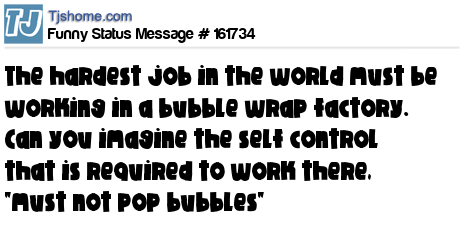X says The hardest job in the world must be working in a bubble wrap factory. Can you imagine the self control that is required to work there, "must not pop bubbles"