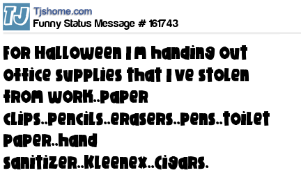 X says For Halloween I’m handing out office supplies that I’ve stolen from work..paper clips..pencils..erasers..pens..toilet paper..hand sanitizer..Kleenex..Cigars.