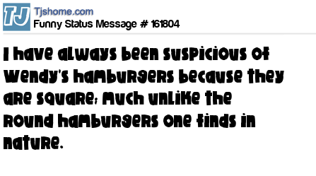 - # 148901 I have always been suspicious of Wendy's hamburgers because they are square,,,, much unlike the round hamburgers one finds in nature.