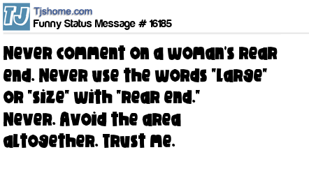 X Never comment on a woman's rear end. Never use the words "large" or "size" with "rear end." Never. Avoid the area altogether. Trust me.