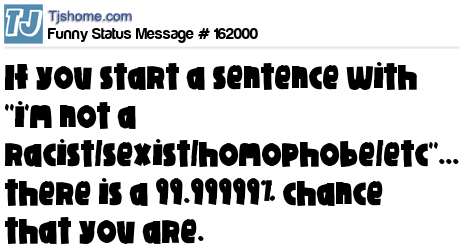 X says If you start a sentence with ''i'm not a racist/sexist/homophobe/etc''... there is a 99.99999% chance that you are.