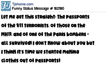 X says Let me get this straight: The passports of the 9/11 terrorists, of those on the MH17, and of one of the Paris bombers - all survived! I don't know about you but I think it's time we started making clothes out of passports!