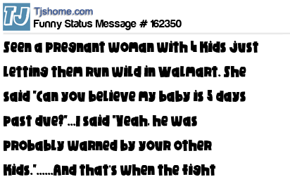 X says Seen a pregnant woman with 4 kids just letting them run wild in Walmart. She said "Can you believe my baby is 5 days past due?"...I said "Yeah, he was probably warned by your other kids."......And that's when the fight started....