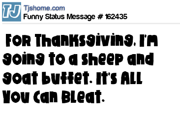 X says For Thanksgiving, I'm going to a sheep and goat buffet. It's All You Can Bleat.