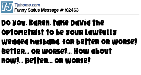 X says Do you, Karen, take David the Optometrist to be your lawfully wedded husband, for better or worse? Better... or worse?... How about now?,,, Better... or worse?
