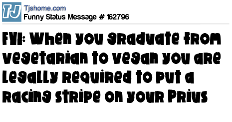 X says FYI: When you graduate from vegetarian to vegan you are legally required to put a racing stripe on your Prius