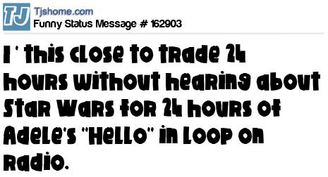 X says I ' this close to trade 24 hours without hearing about Star Wars for 24 hours of Adele's ''Hello'' in loop on radio.