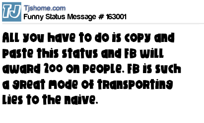 X says All you have to do is copy and paste this status and FB will award 200 on people. FB is such a great mode of transporting lies to the naive.