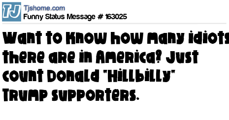 X says Want to know how many idiots there are in America? Just count Donald "Hillbilly" Trump supporters.