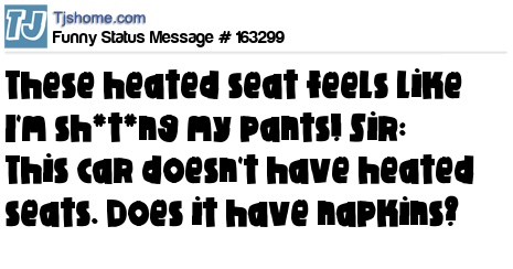 - # 155585 1 [on a test drive] Me: Haha the heated seat feels like I peed my pants! Dealer: This car doesn't have heated seats. Me: Does it have napkins?