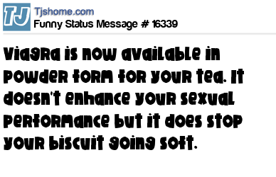 - # 184118 Viagra is now available in powder form for your tea. It doesn't enhance your sexual performance but it does stop your biscuit going soft