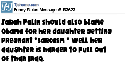 X says Sarah Palin should also blame Obama for her daughter getting pregnant *sarcasm * Well her daughter is harder to pull out of than Iraq.