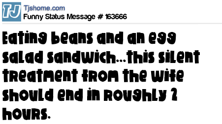 X says Eating beans and an egg salad sandwich...this silent treatment from the wife should end in roughly 2 hours.