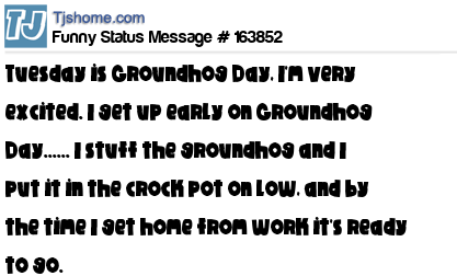 X says Tuesday is Groundhog Day, I'm very excited. I get up early on Groundhog Day...... I stuff the groundhog and I put it in the crock pot on low, and by the time I get home from work it's ready to go.