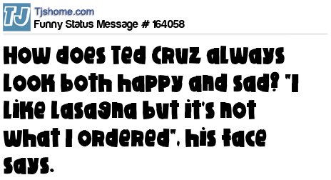 X says How does Ted Cruz always look both happy and sad? "I like lasagna but it's not what I ordered", his face says.