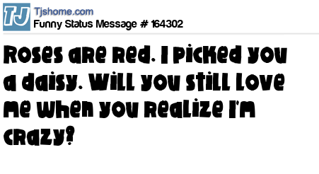 X says Roses are red. I picked you a daisy. Will you still love me when you realize I'm crazy?