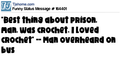X says "Best thing about prison, man, was crochet. I loved crochet" -- Man overheard on bus
