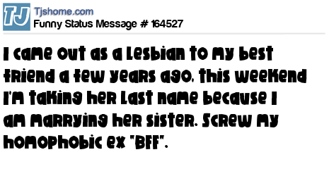 X says I came out as a lesbian to my best friend a few years ago, this weekend I'm taking her last name because I am marrying her sister. Screw my homophobic ex "BFF".