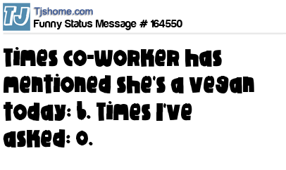 X says Times co-worker has mentioned she's a vegan today: 6. Times I've asked: 0.