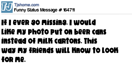 - # 97535 if I ever go missing, I want my photo on beer bottles instead of milk cartons because I want someone fun to find me."