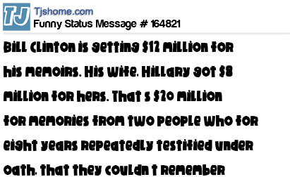 X Bill Clinton is getting $12 million for his memoirs. His wife, Hillary got $8 million for hers. That’s $20 million for memories from two people who for eight years repeatedly testified under oath, that they couldn’t remember anything.