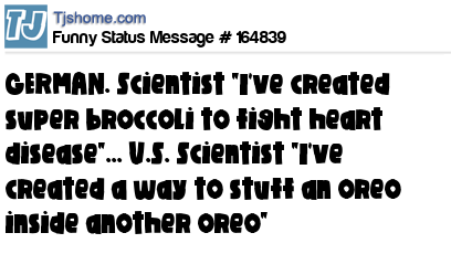 - # 175108 German Scientist: "I've created a super broccoli to fight heart disease!" American Scientist: "I've created a way to stuff an Oreo inside another Oreo!"
